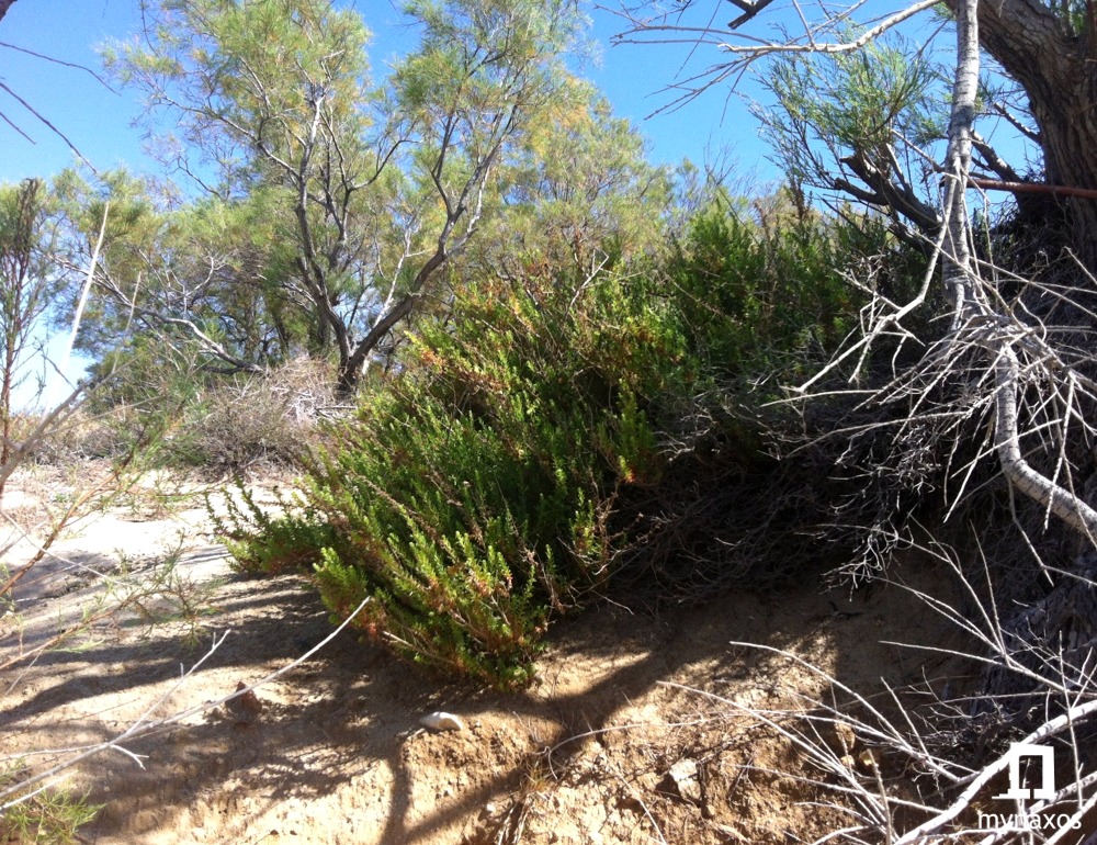 The landscape at Kastraki beach alternates between the rocky isolated coves with shady cedar trees and the sandy beach.