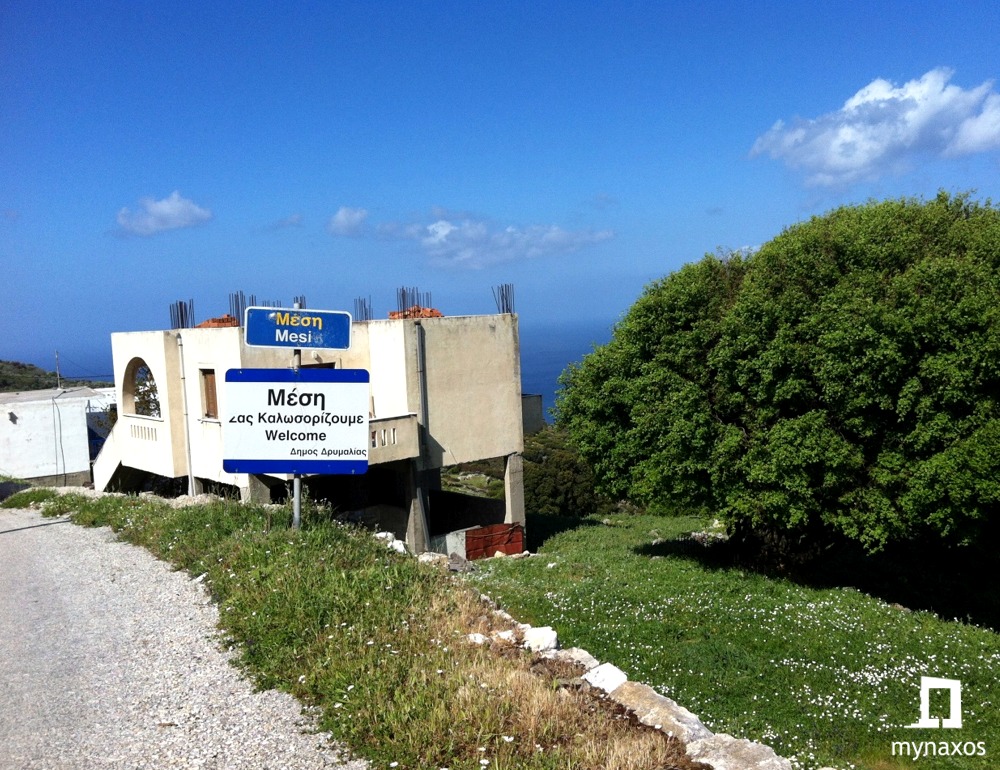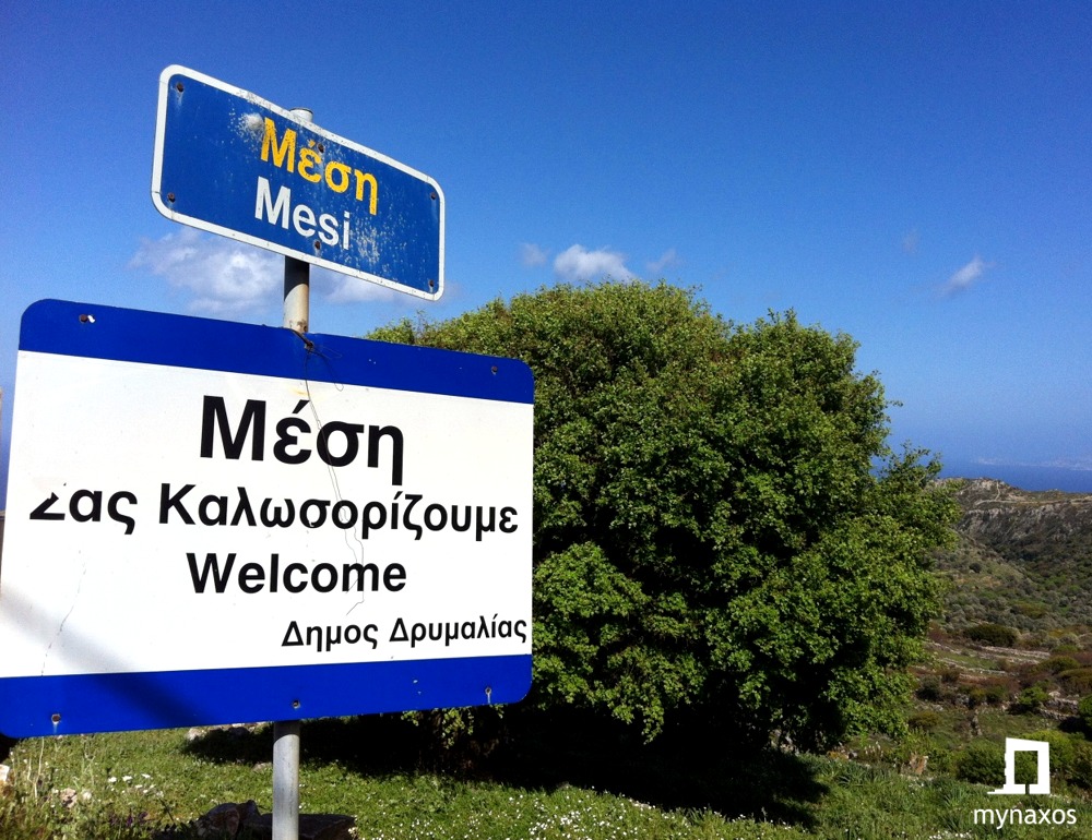 The village of Mesi was named after its geographical location: It is located in the middle( mesi) of the distance from the villages Skados and Apollonas.